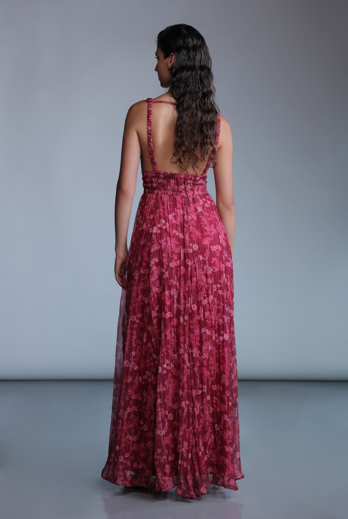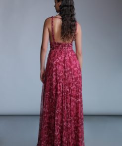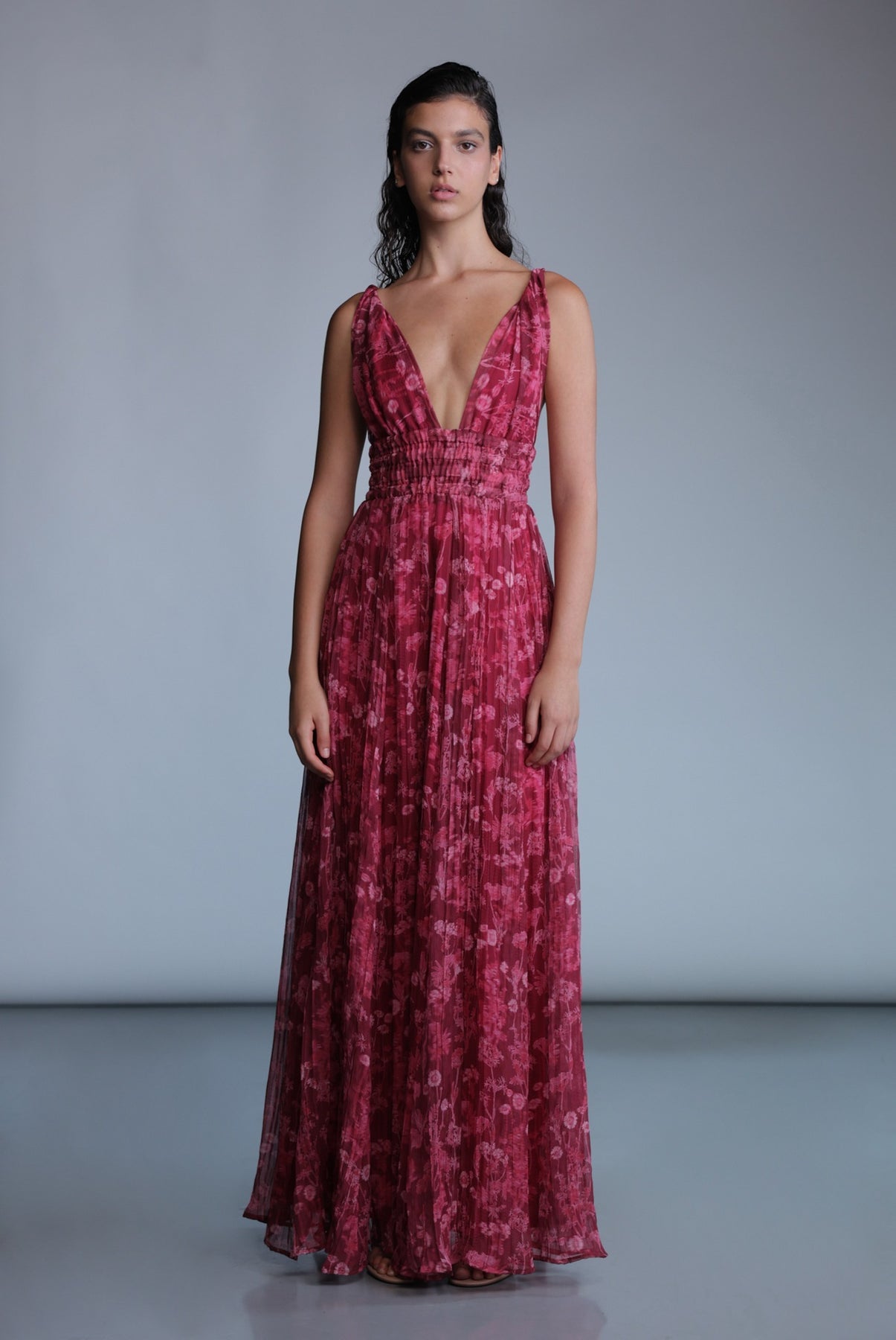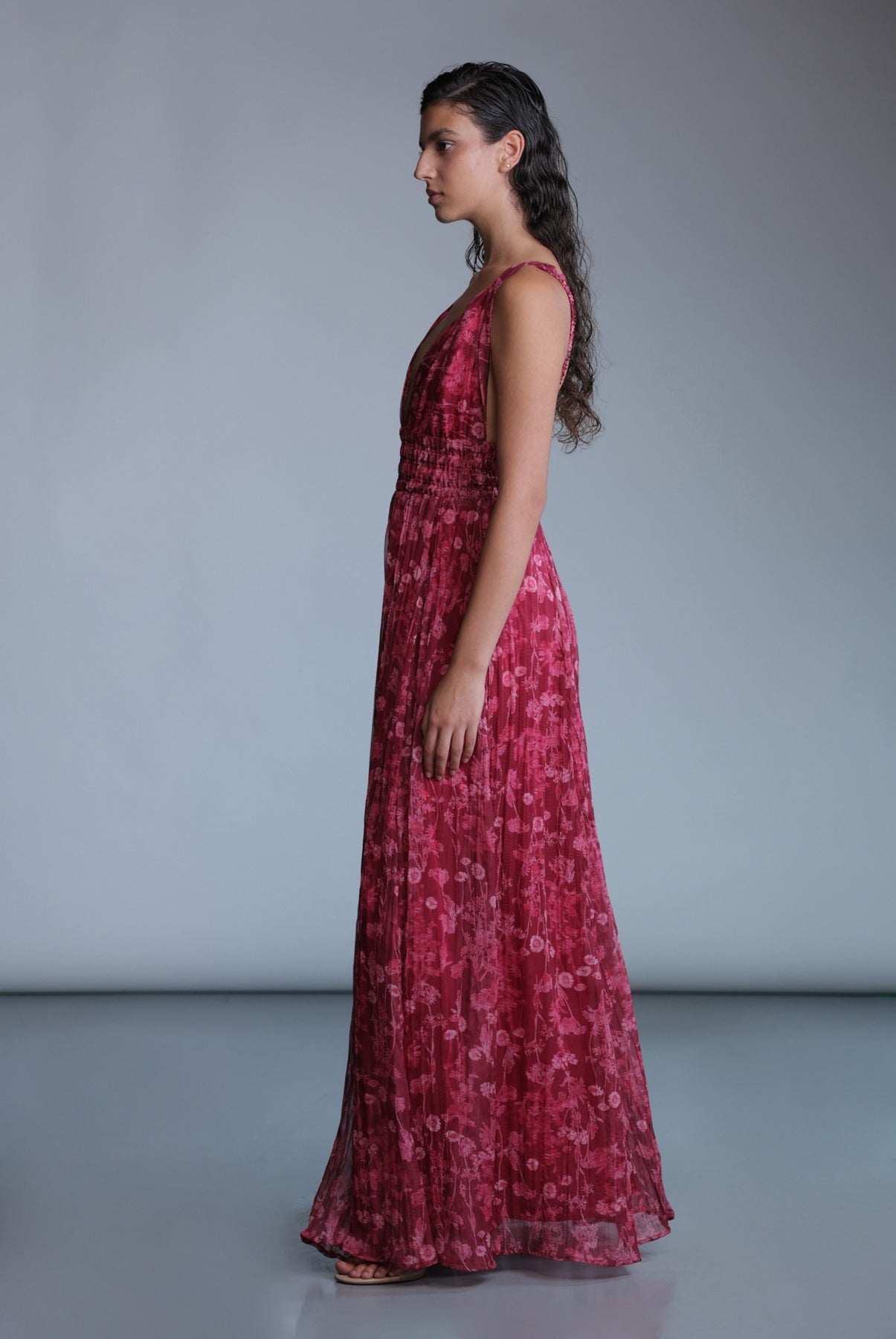 Wild flower print maxi dress with deep V-neckline, and elastic waist.