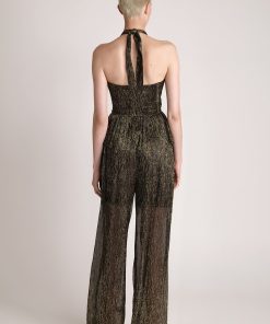 Ray lurex with sprinkled foil top with adjustable halter neckline, unique front cutouts, and open back with invisible zipper.