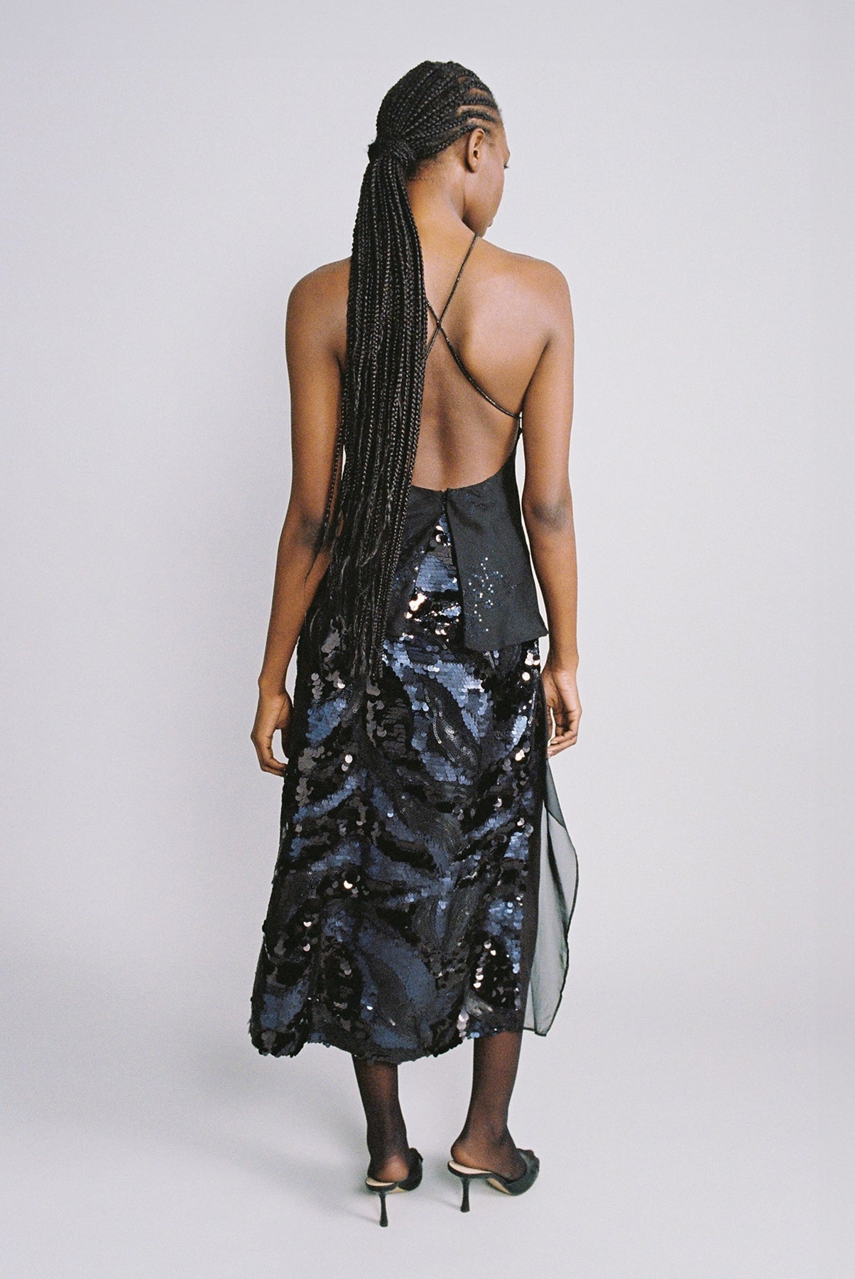 Embroidered chiffon halter neck top with thin straps that cross at the back.