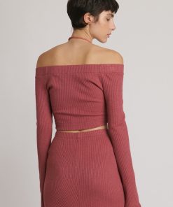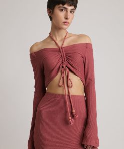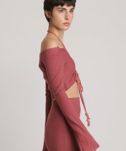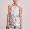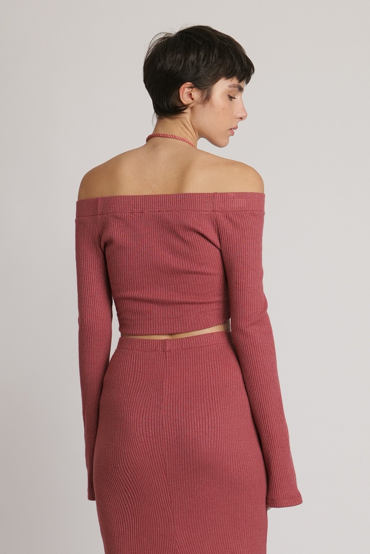 Lurex rib knit halter neck top with an open back, and flared sleeves.