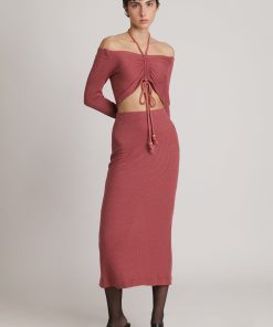 Lurex rib knit halter neck top with an open back, and flared sleeves.