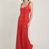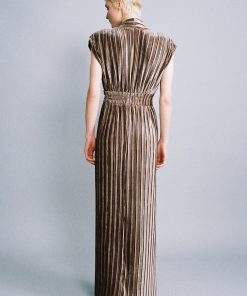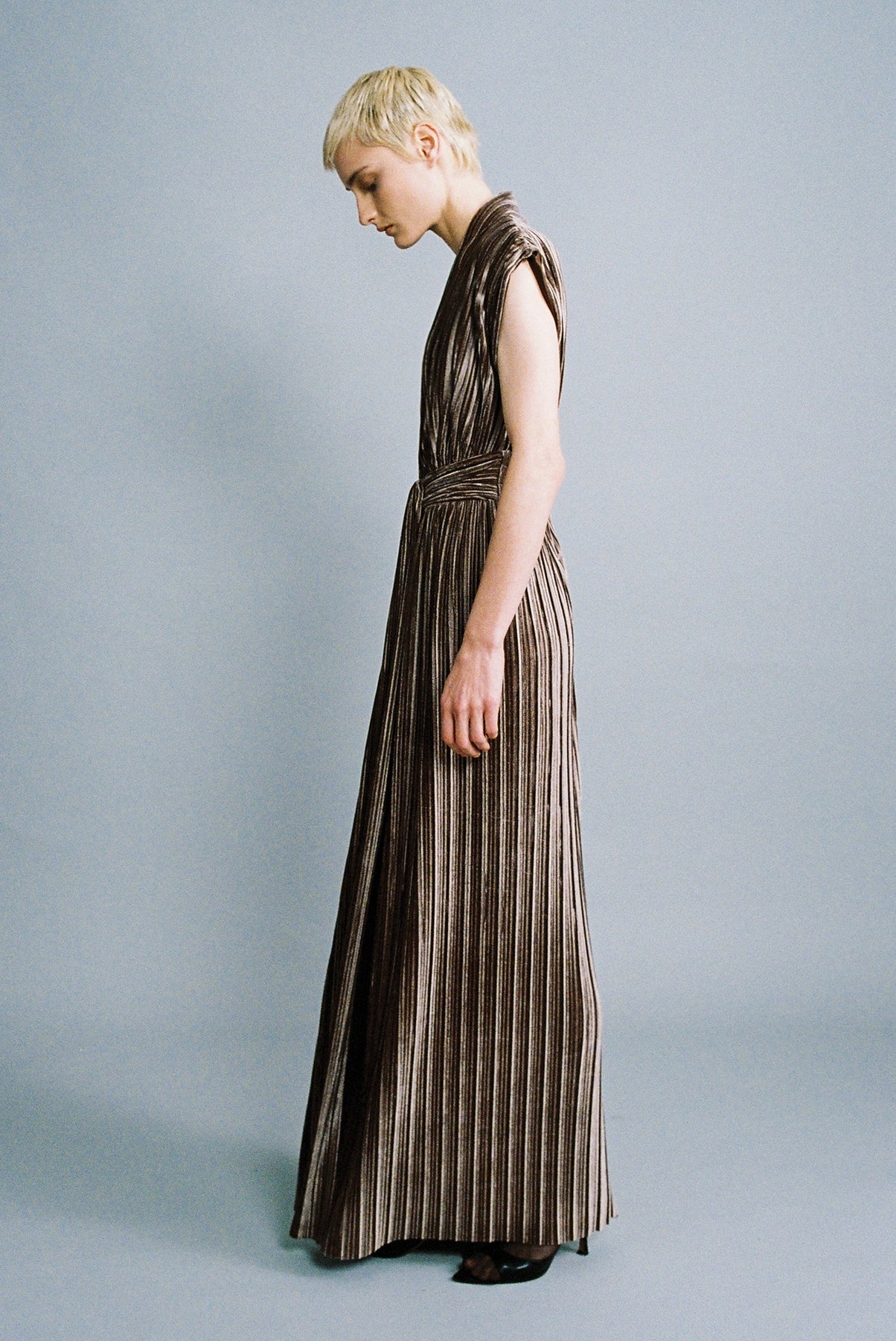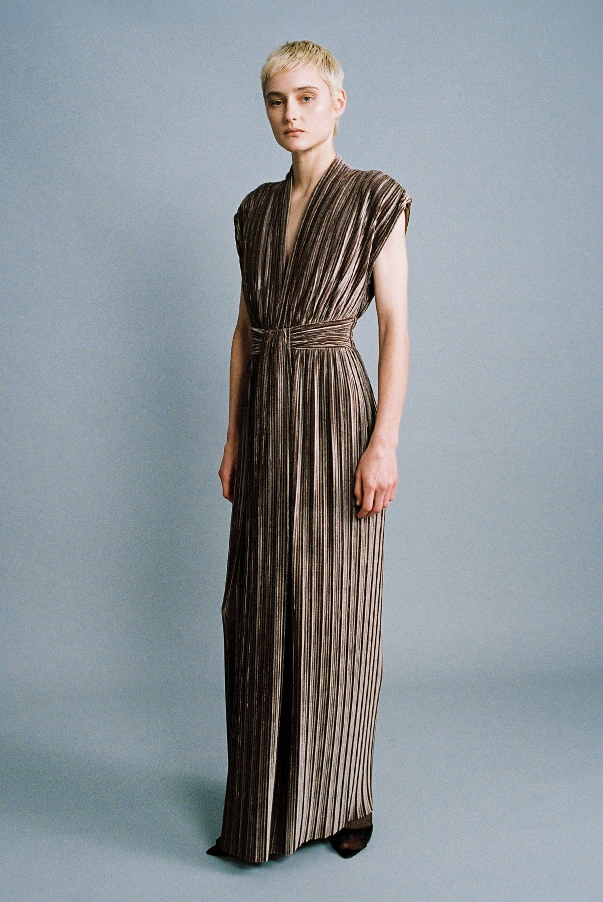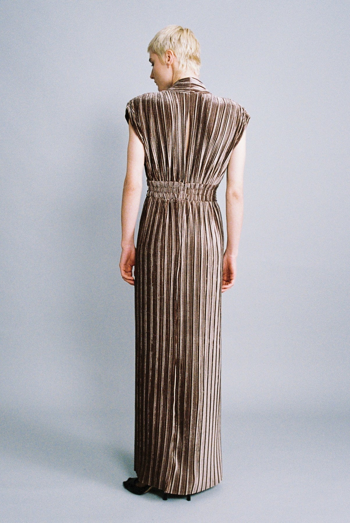Pleated velvet sleeveless maxi wrap dress featuring a deep V-neckline, shoulder pads, and front slit. Draped fabric detail at front.