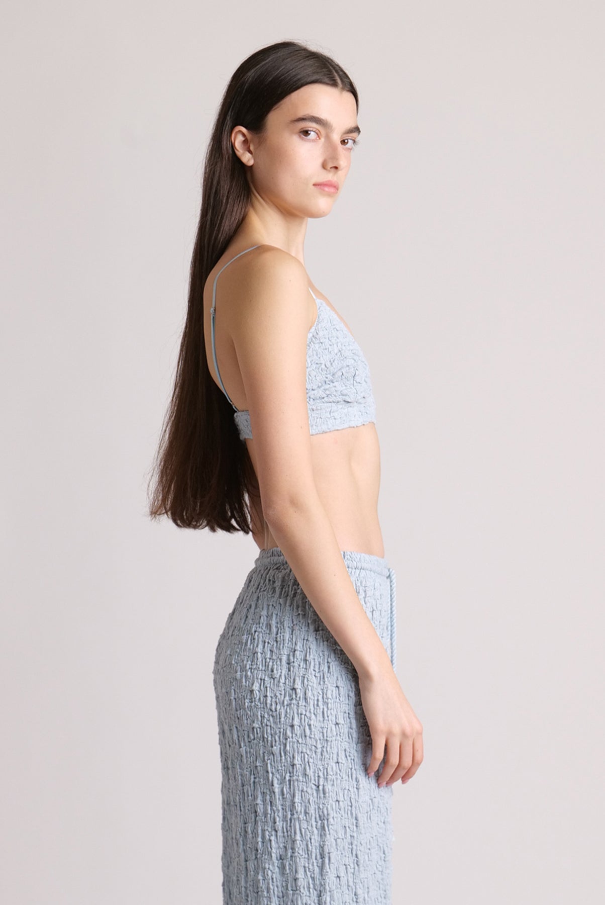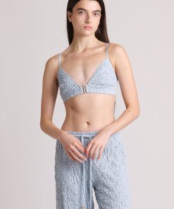 Crinkled knit bra with front buckle fastening.