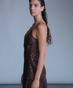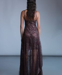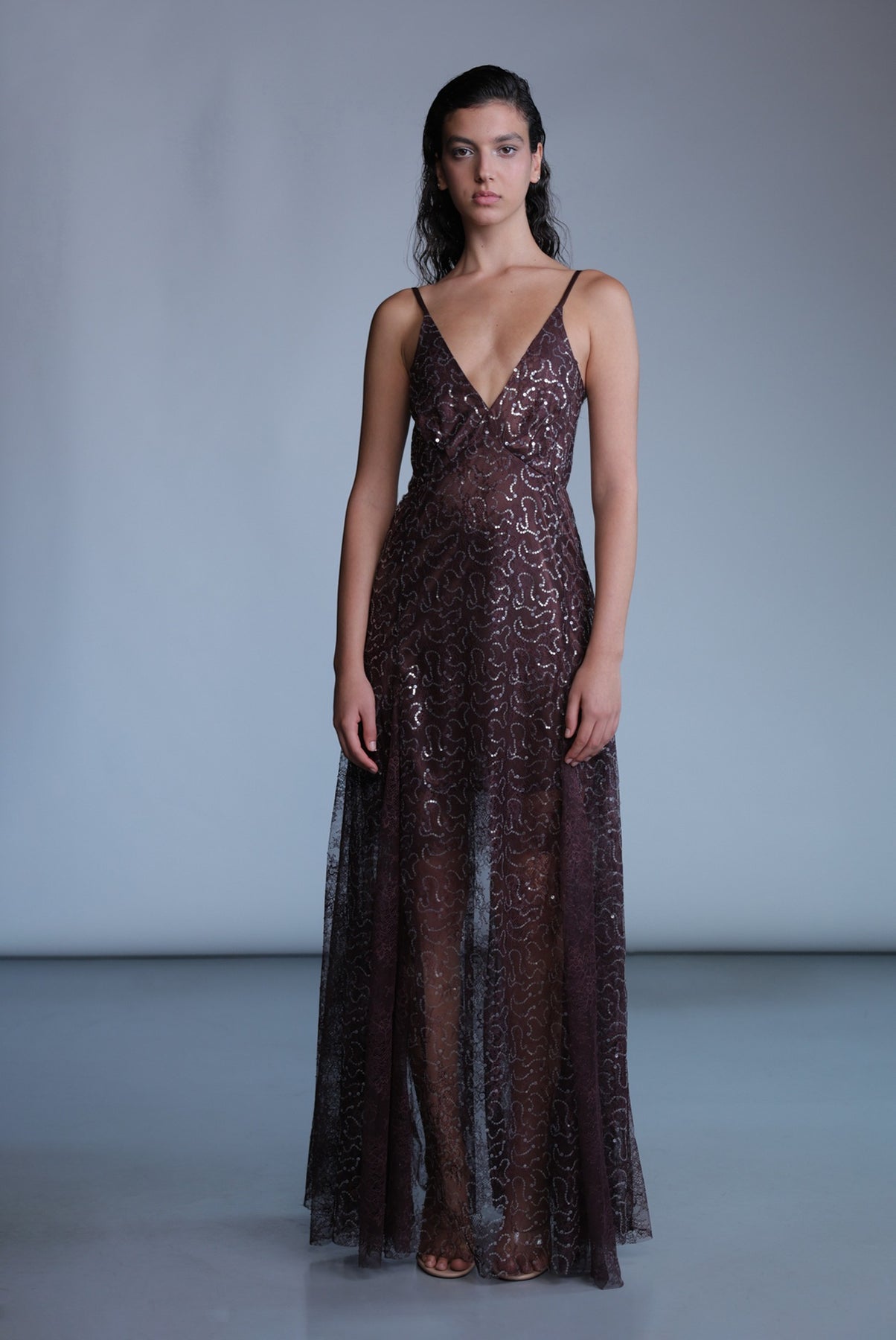 Sequined lace flaunting maxi dress with a V-neckline, thin adjustable straps and invisible zipper at the back.