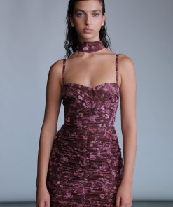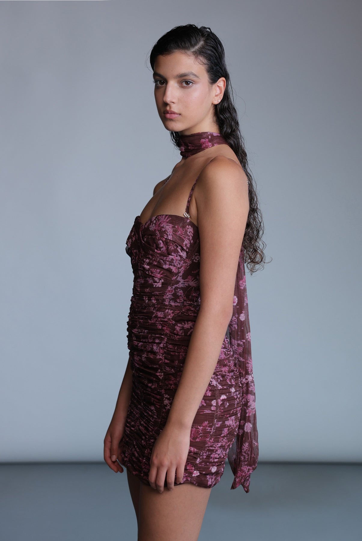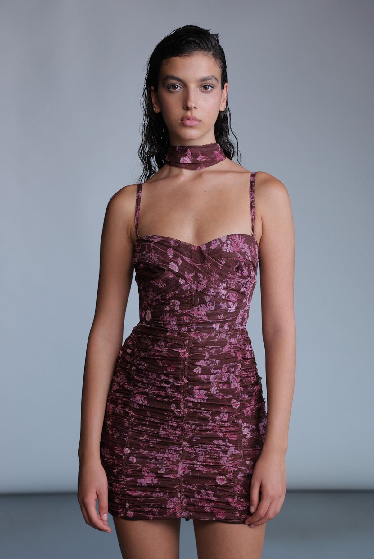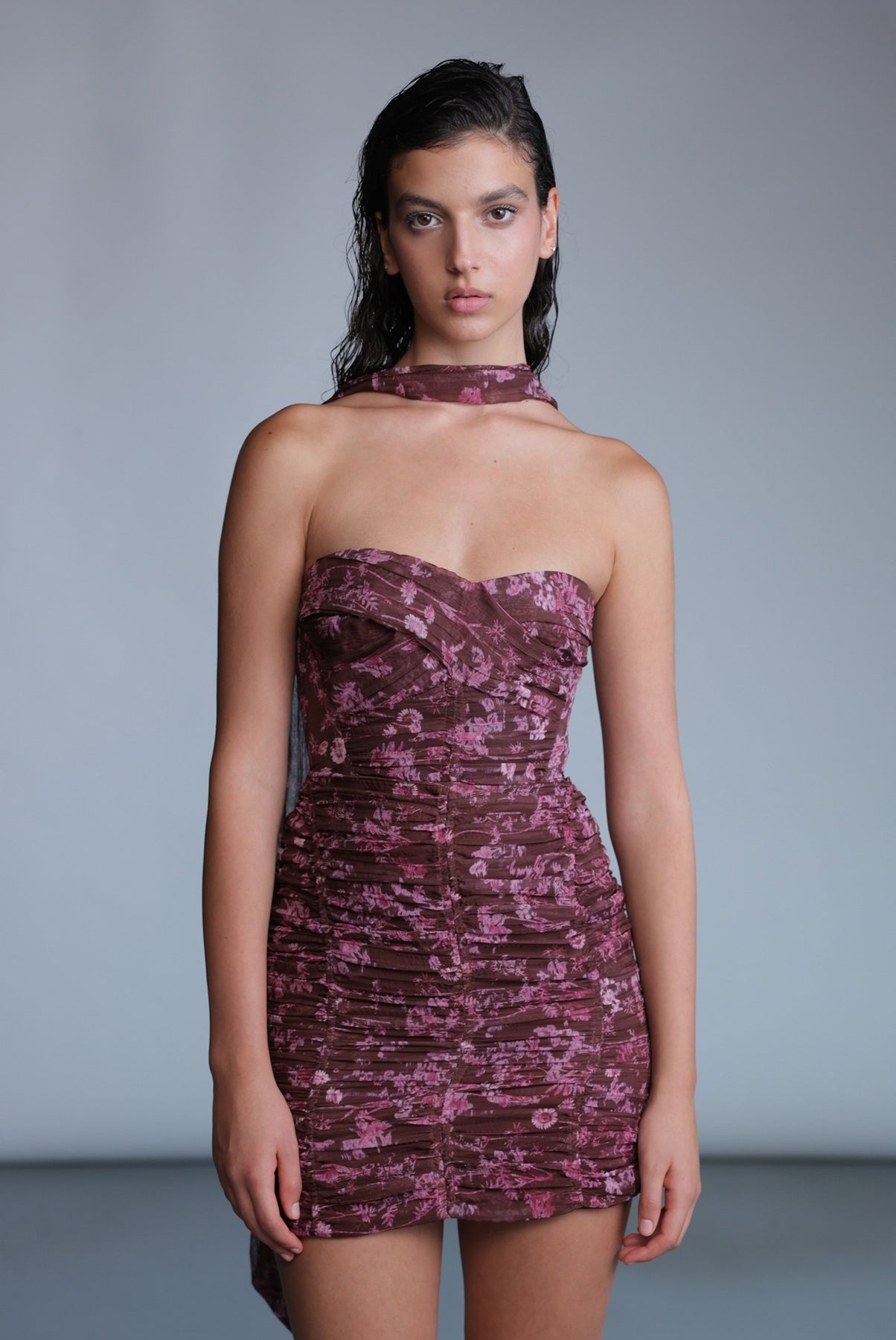 Wild flower print mini strapless dress with a twisted front detail, and back lacing with detachable straps.