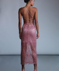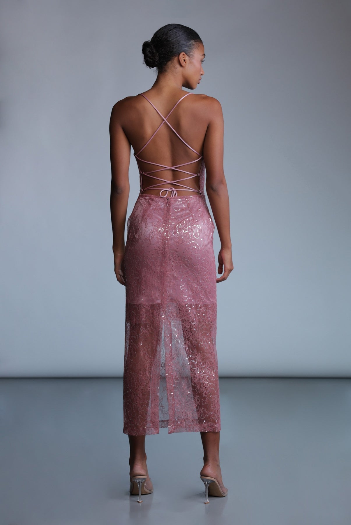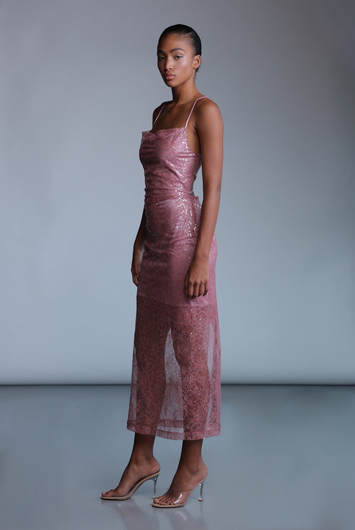 Sequined lace midi dress with a cowl neckline, adjustable straps that cross at the back with a tie, and an invisible zipper at the back with a slit at the hem.