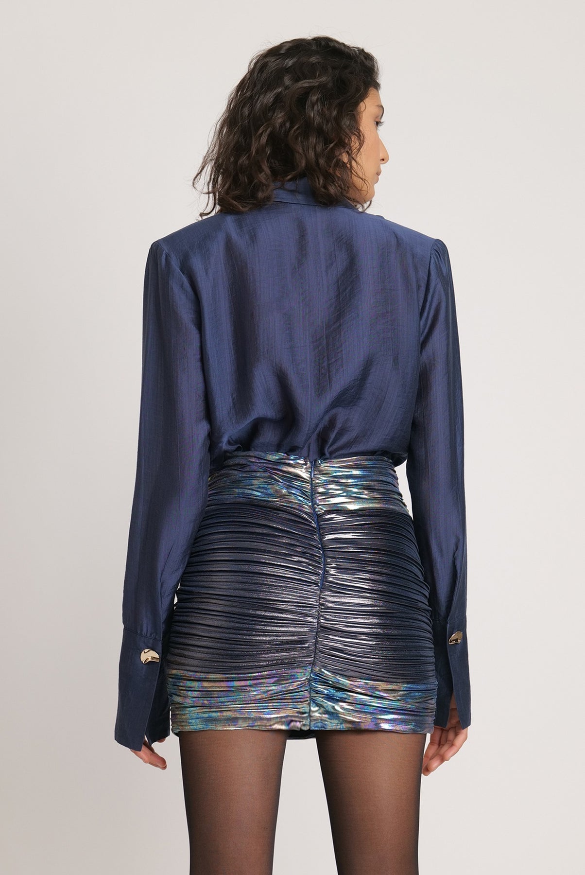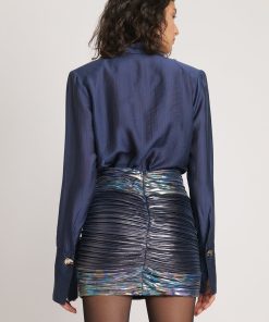 Two-tone pleated knit with foil mini skirt with high waist, and gathering details.