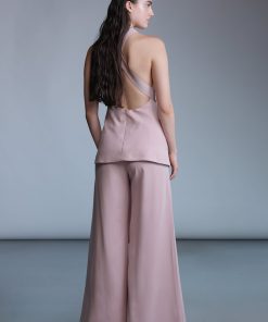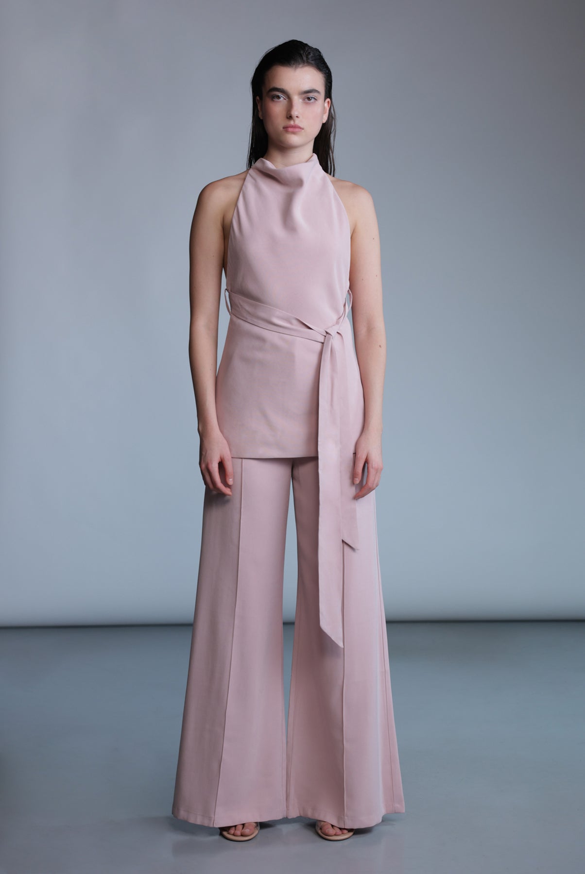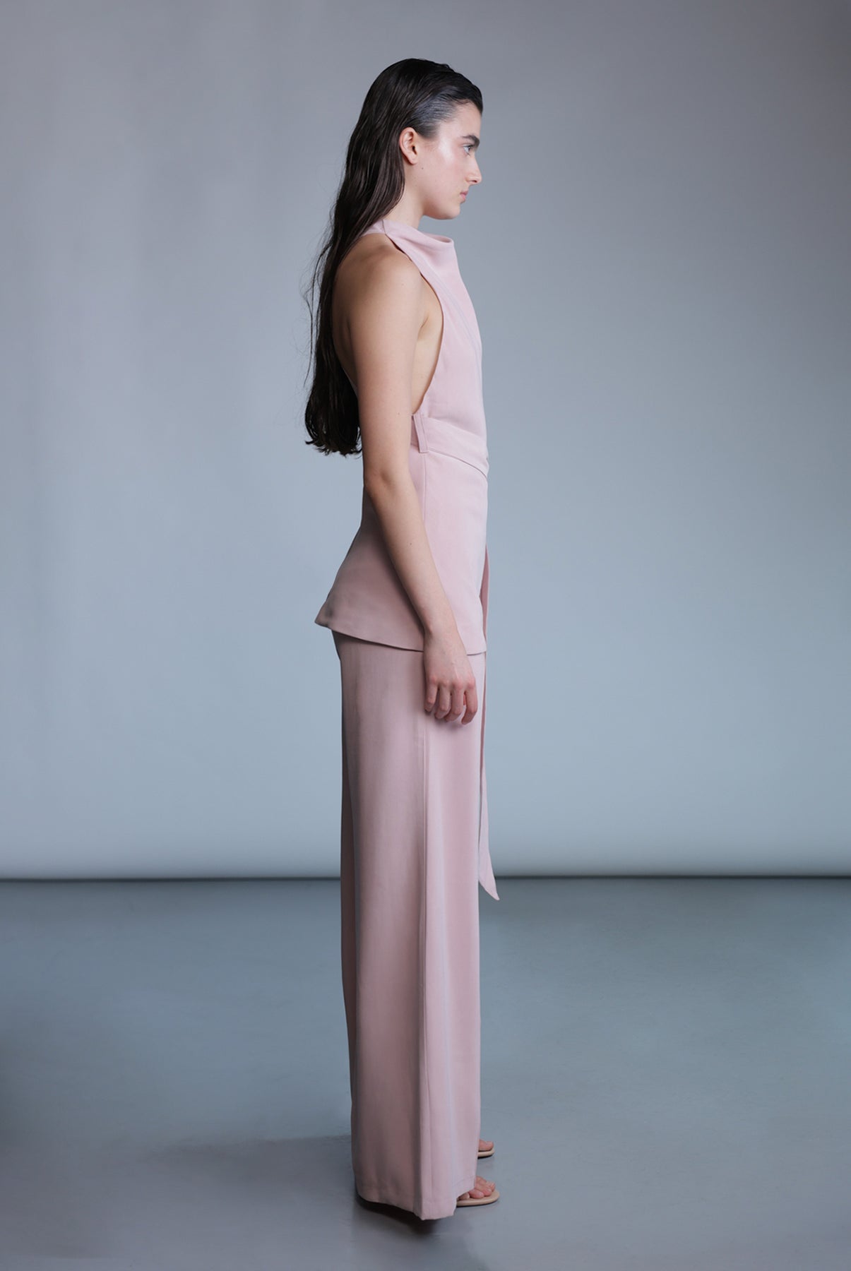 Diagonal viscose blend top with a cowl neckline, and adjustable wide straps that cross at the back with a tie.