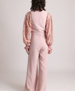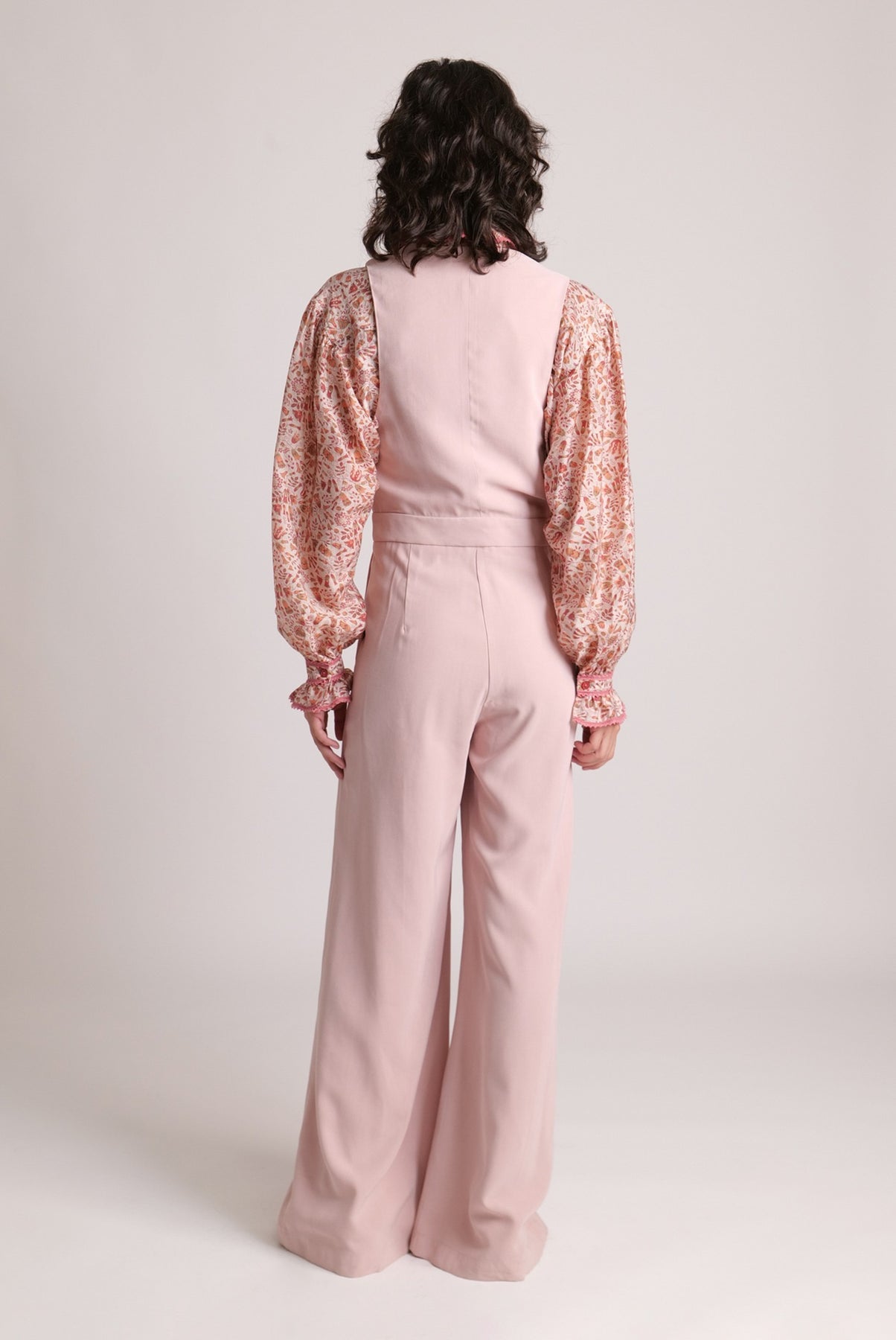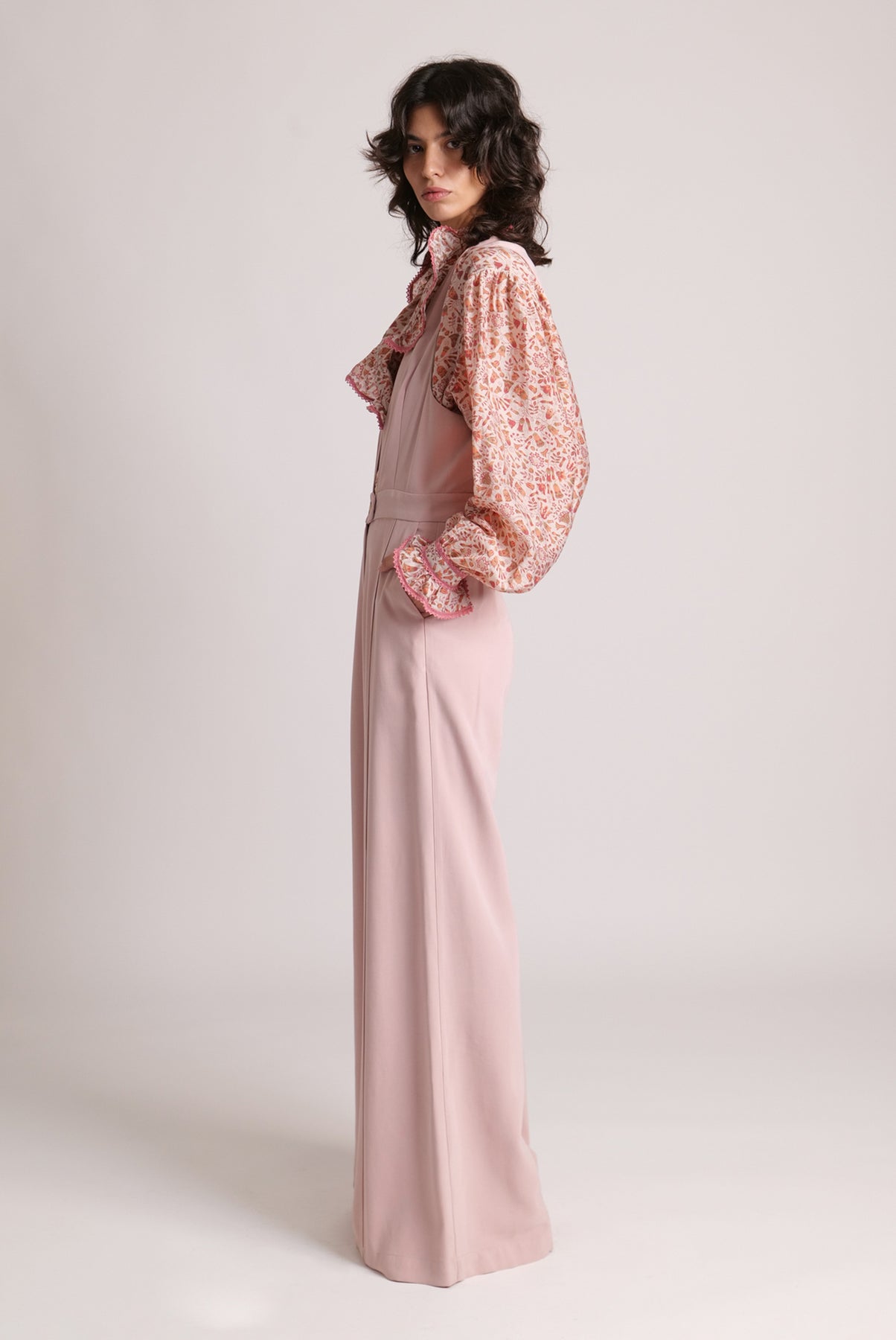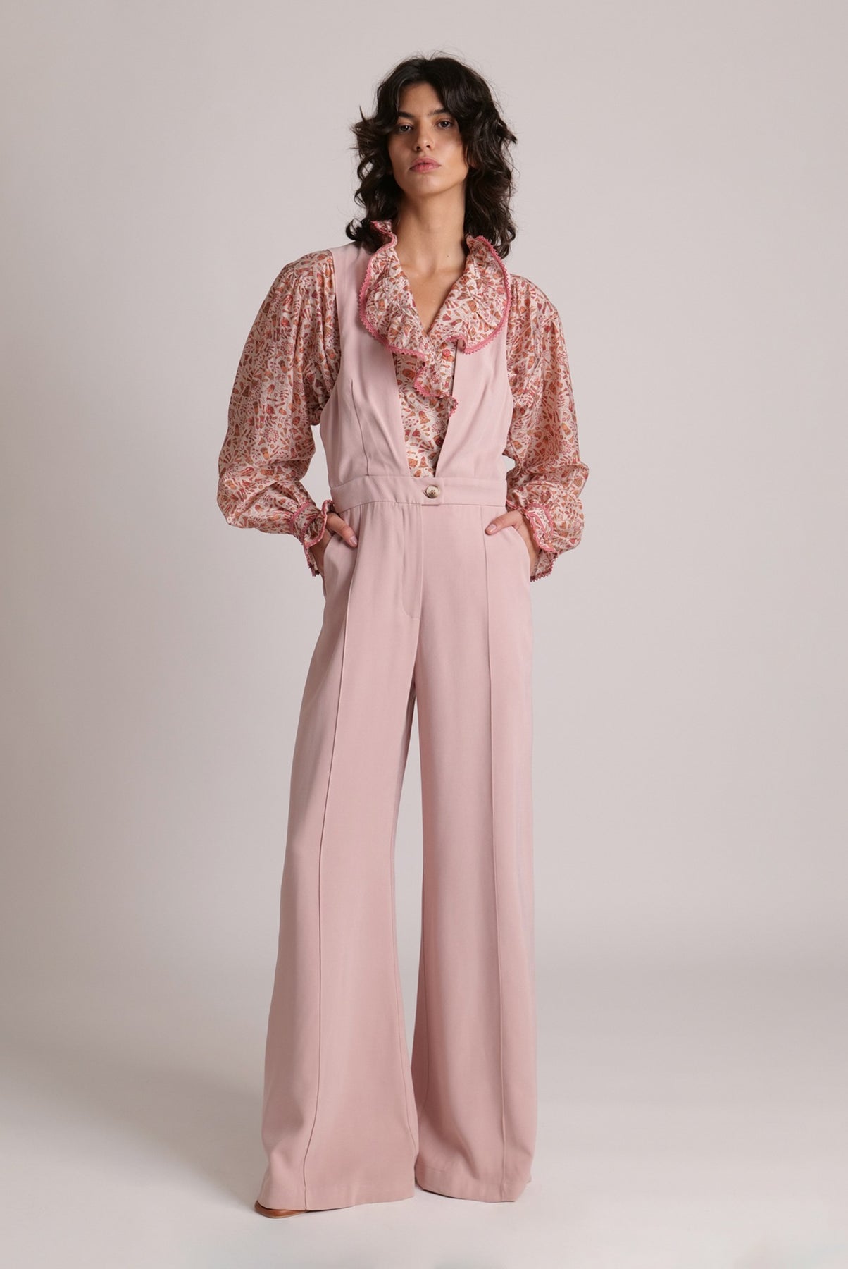 Diagonal viscose blend jumpsuit with a V- neckline and wide leg featuring side pockets and button fastening on the front.