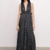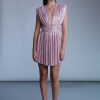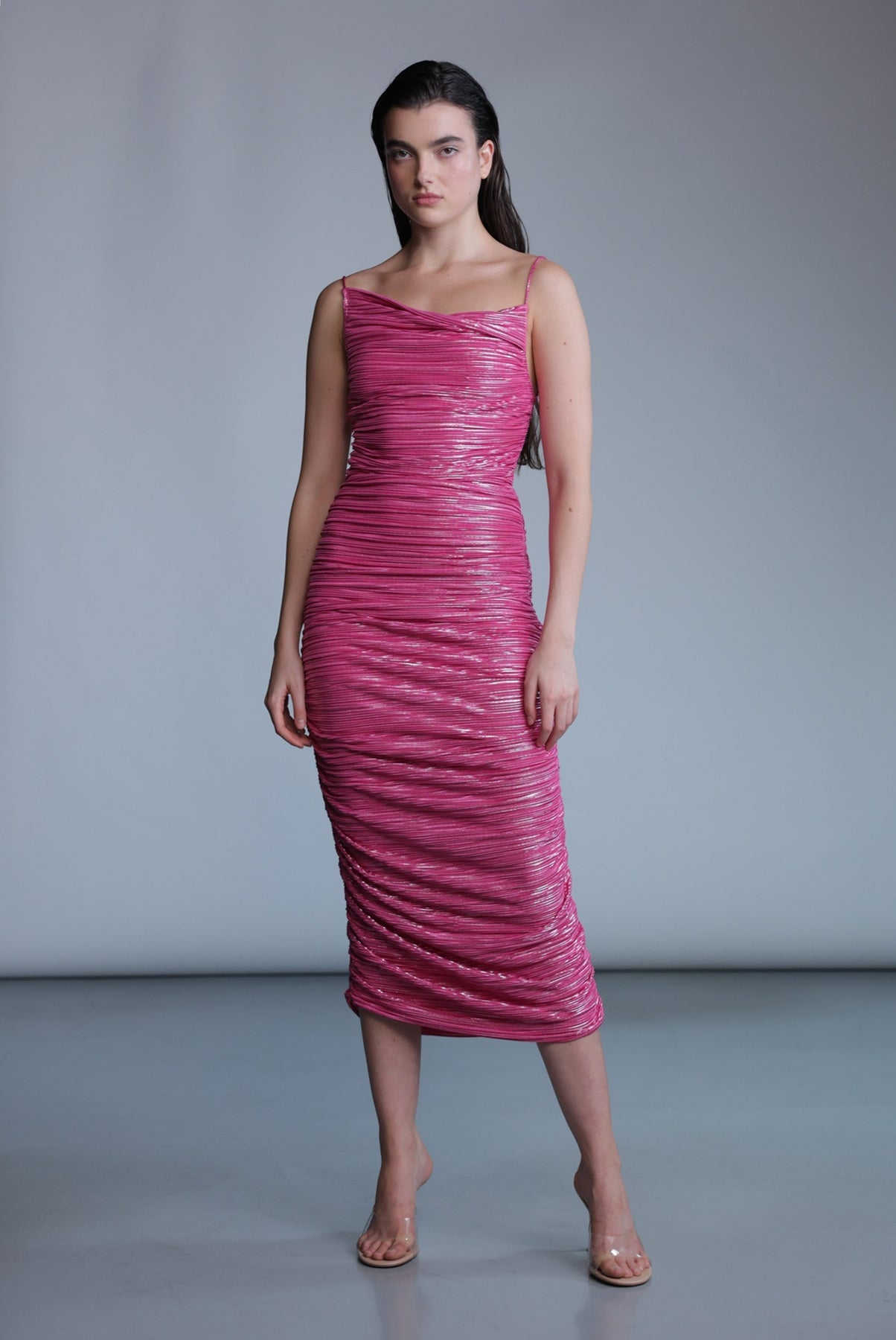 Pleated knit with foil midi dress with asymmetrical top featuring adjustable thin straps that cross at the back with a tie.