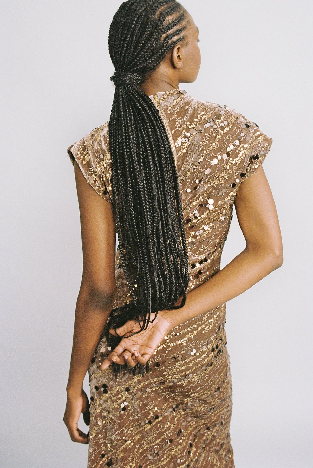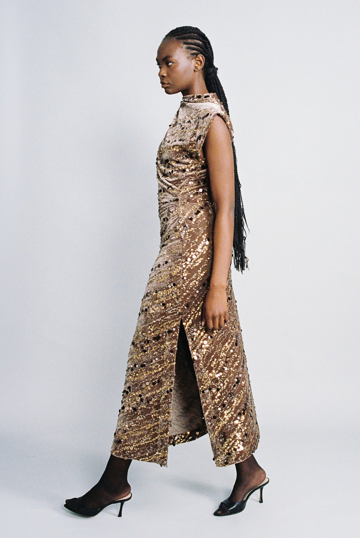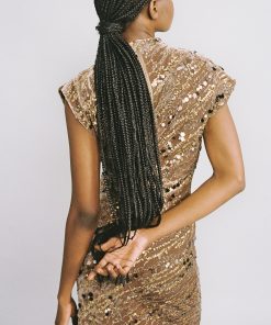 Stripe sequins on velvet asymmetrical midi dress featuring gathered detail at the shoulders, invisible zipper at the back.