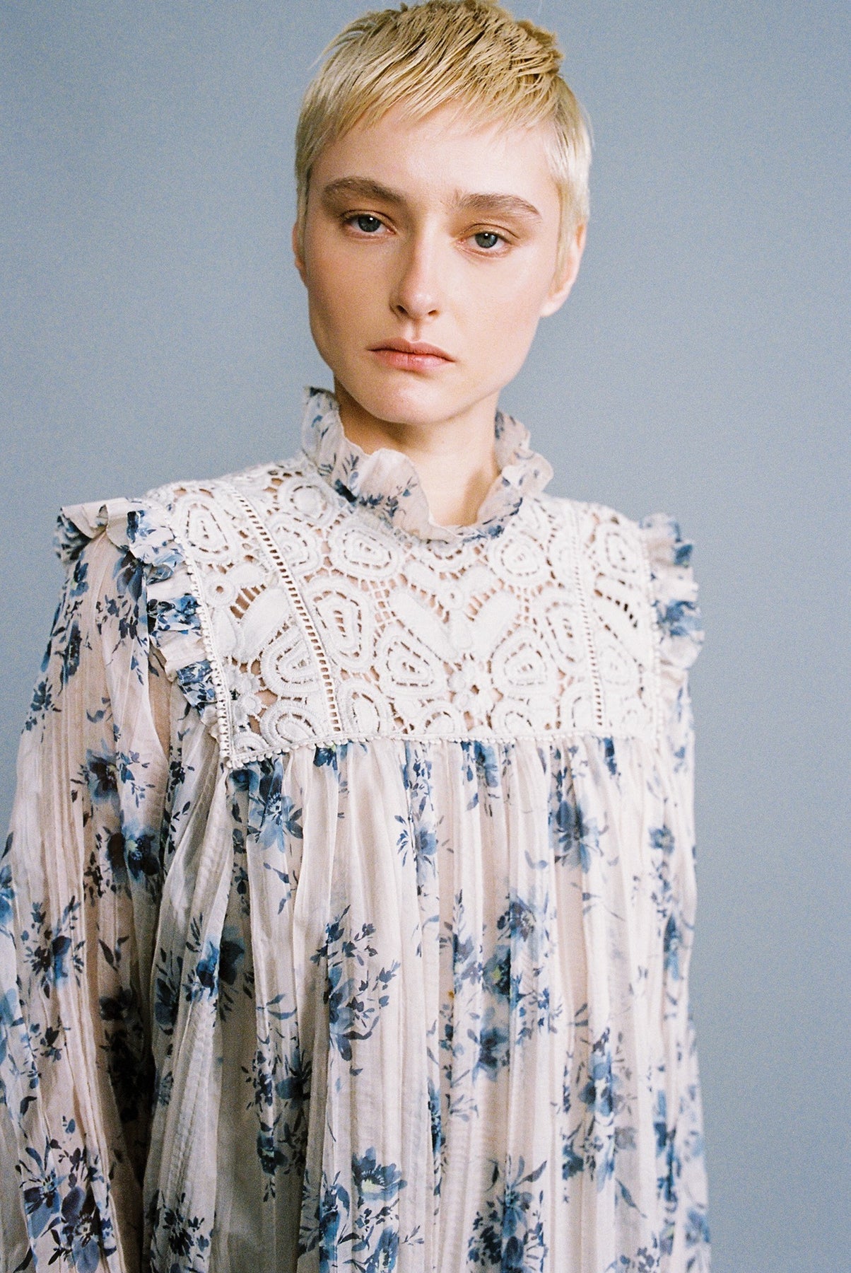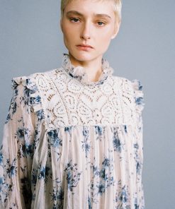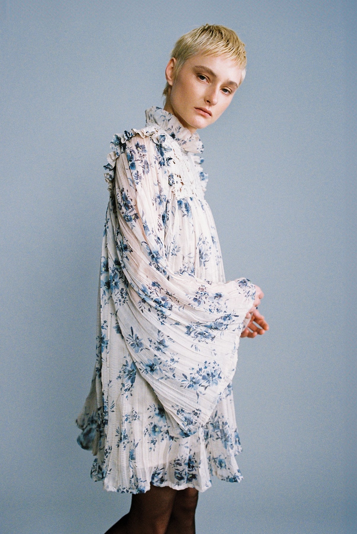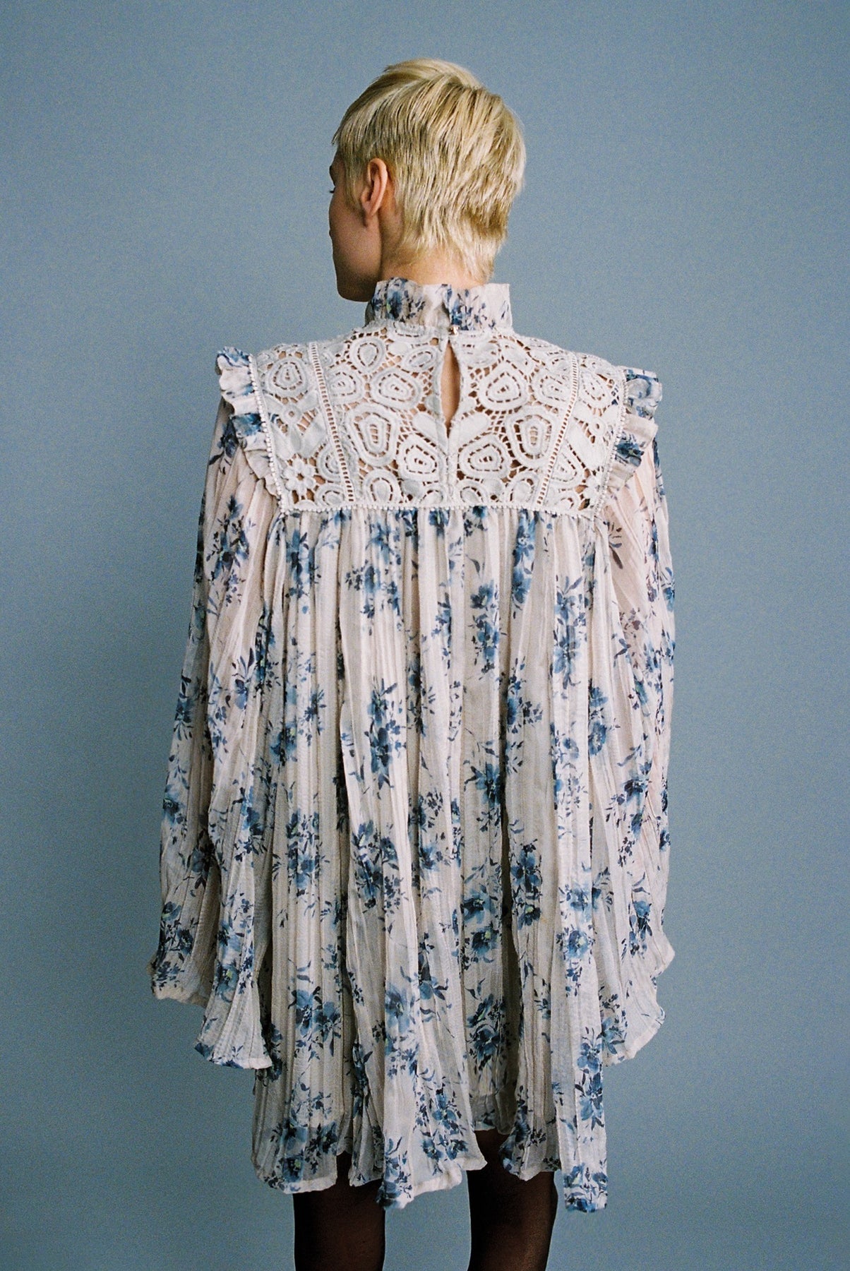 Floral print on crinkled chiffon mini flared dress, long wide sleeves, high neck with ruffle trim.
