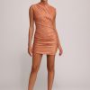 Floral print on crinkled chiffon mini flared dress, long wide sleeves, high neck with ruffle trim.