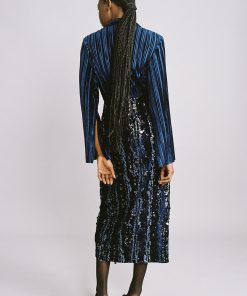 Stripe sequins on velvet pencil skirt with gathering details, front slit, and invisible zipper at the back.