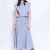 Pleated knit with foil gathering and high-waist skirt with draped fabric detail, front slit, and elastic waist at back with invisible back zipper fastening.