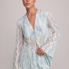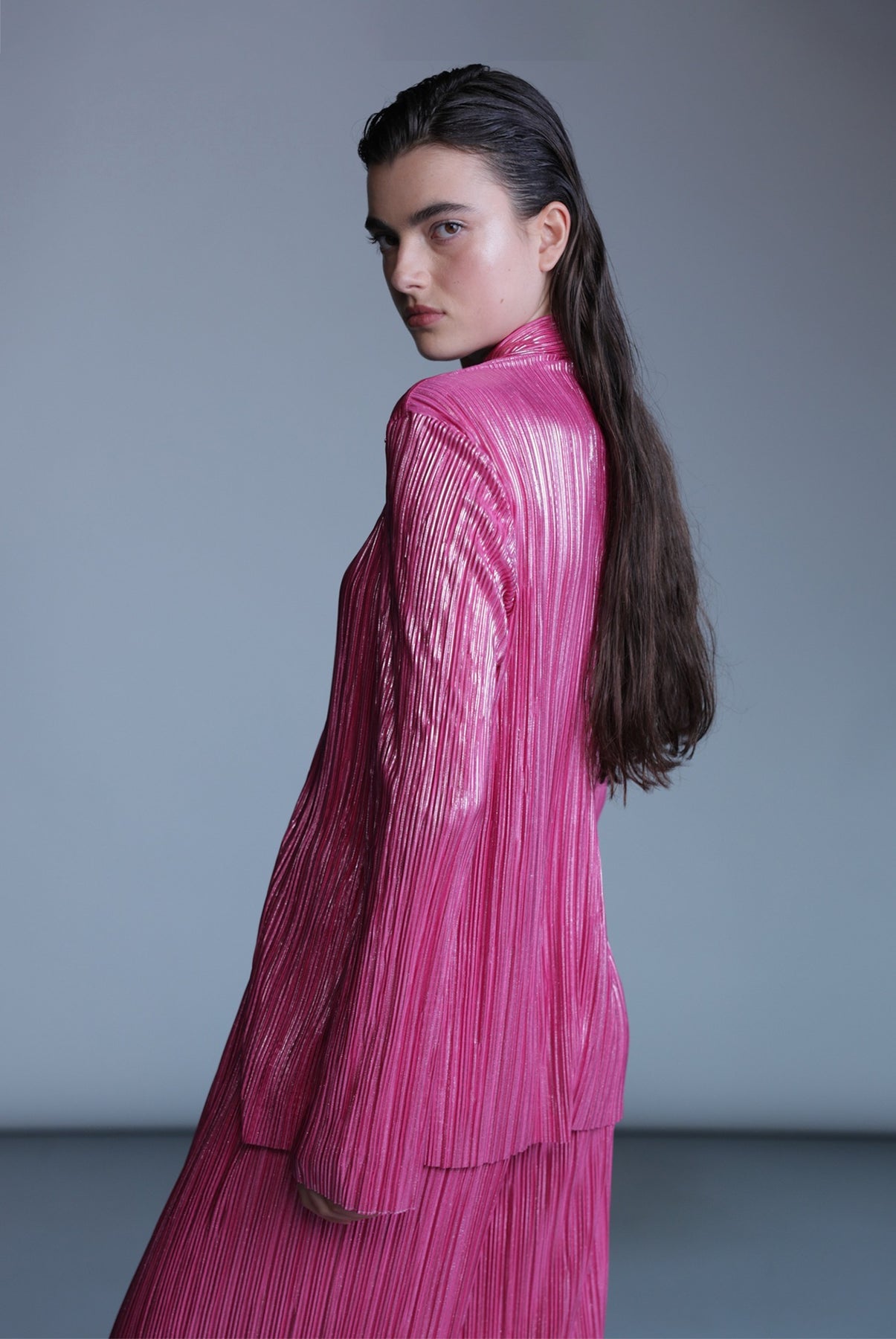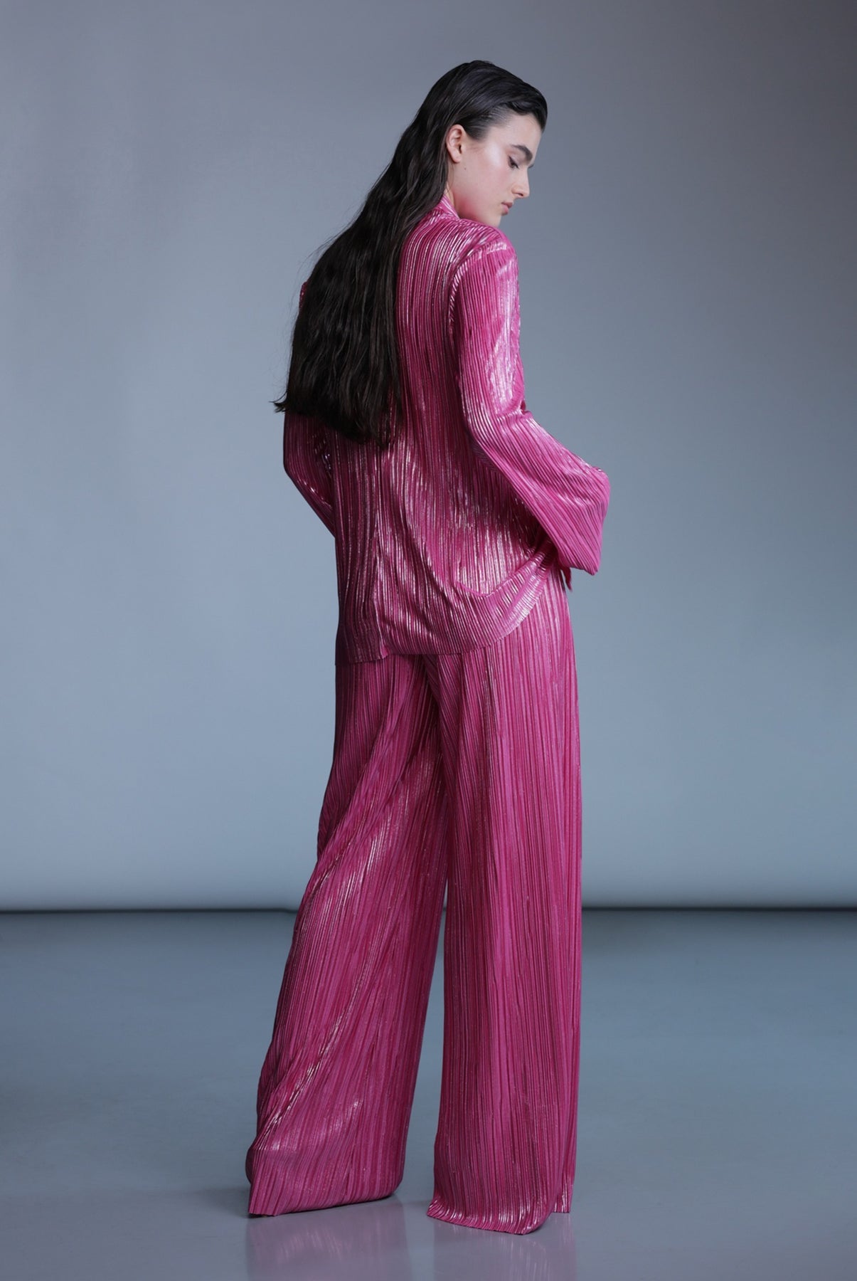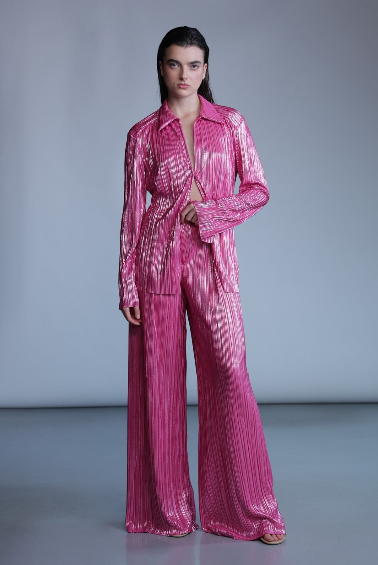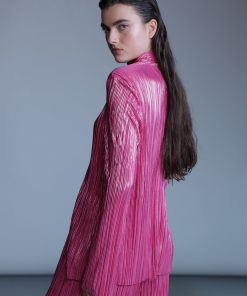Pleated knit with foil top with a collar and long sleeves, and button closure at center front.
