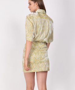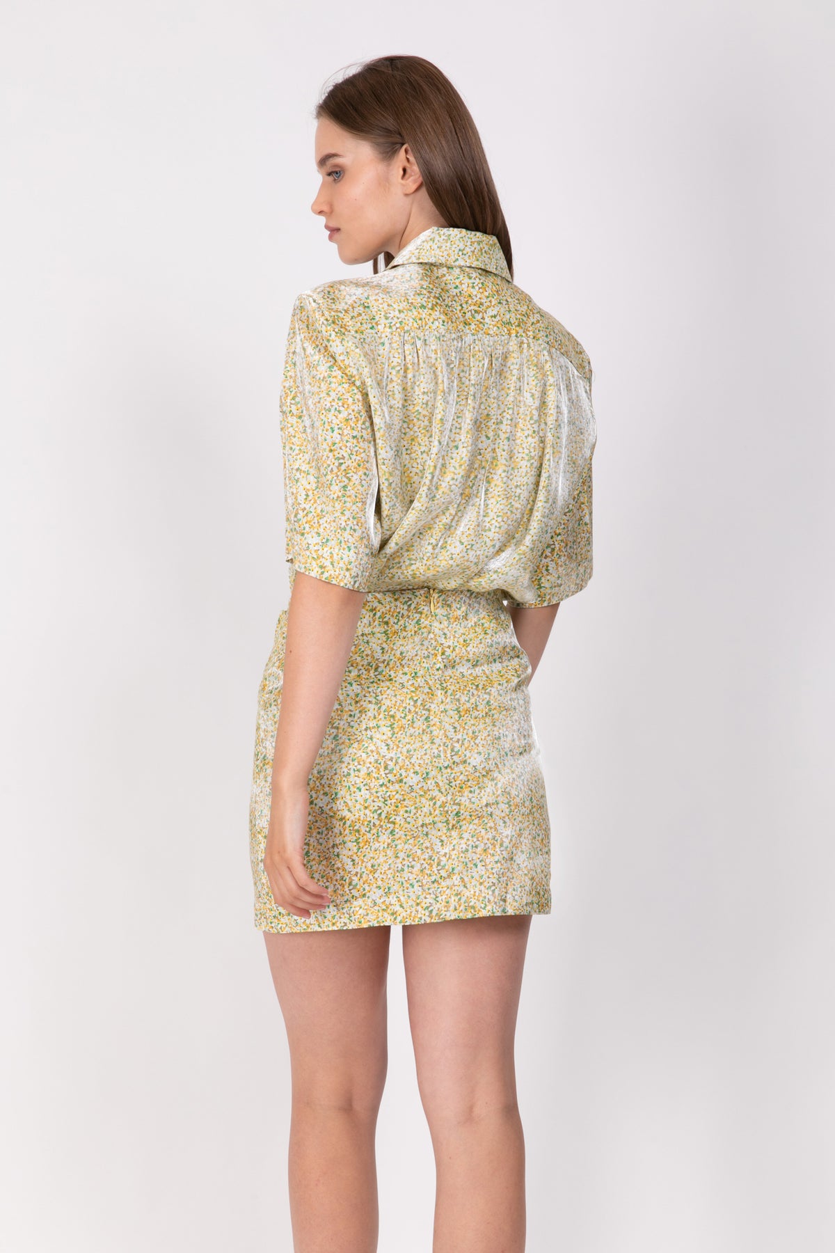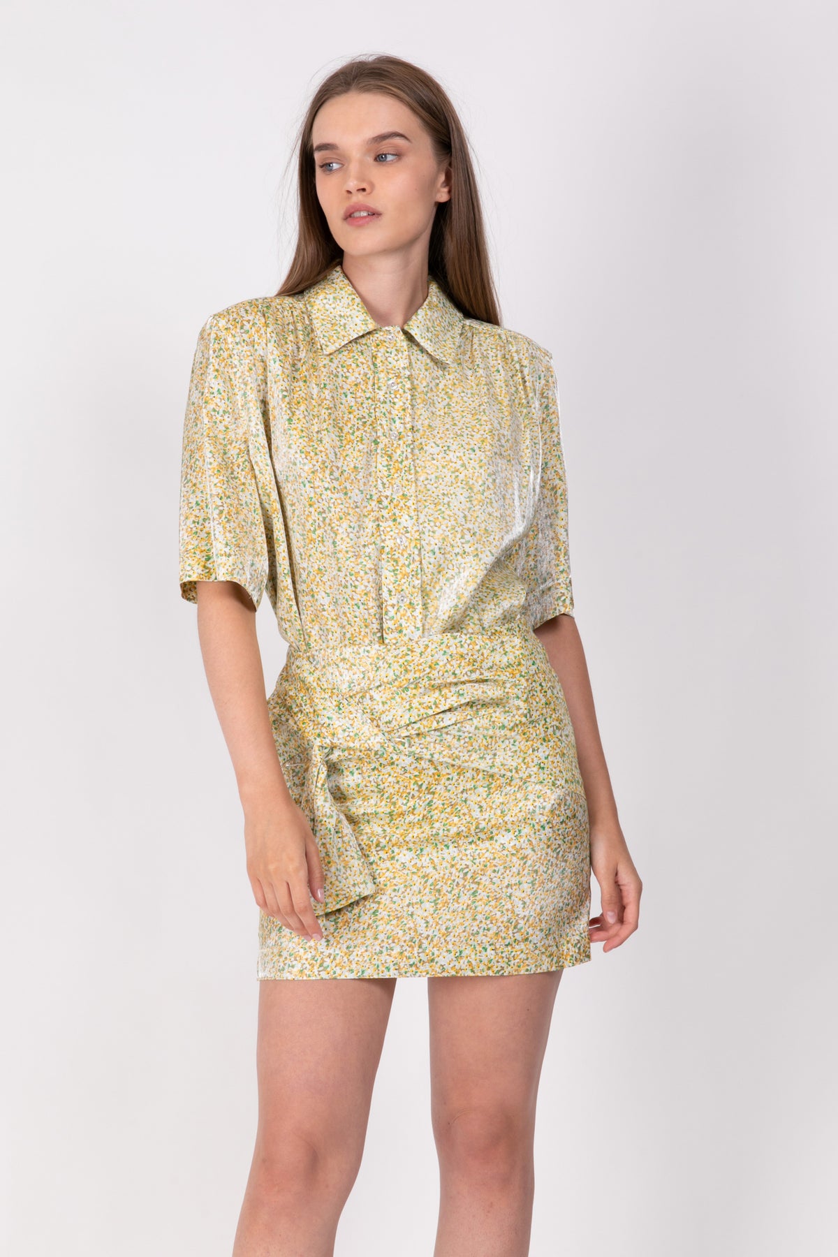 Shiny printed viscose high waisted fitted mini skirt with front tie detail.