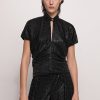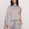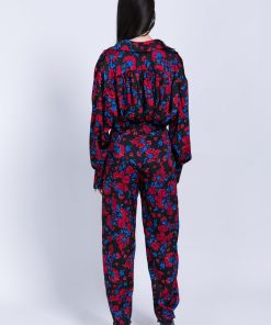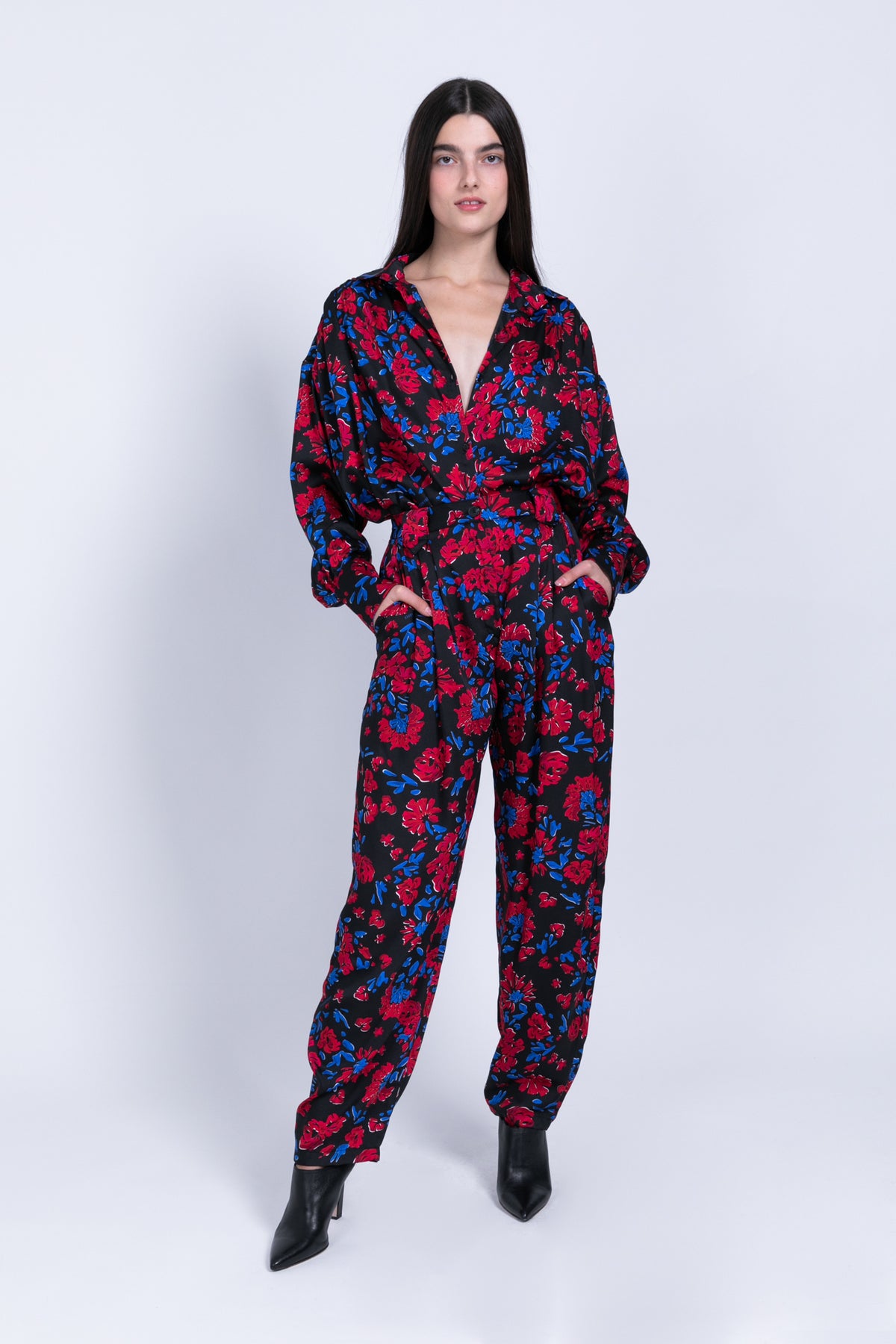 Floral printed satin oversized top with dropshoulders, long sleeves, spread collar,button closure at center front, and button cuffs.