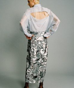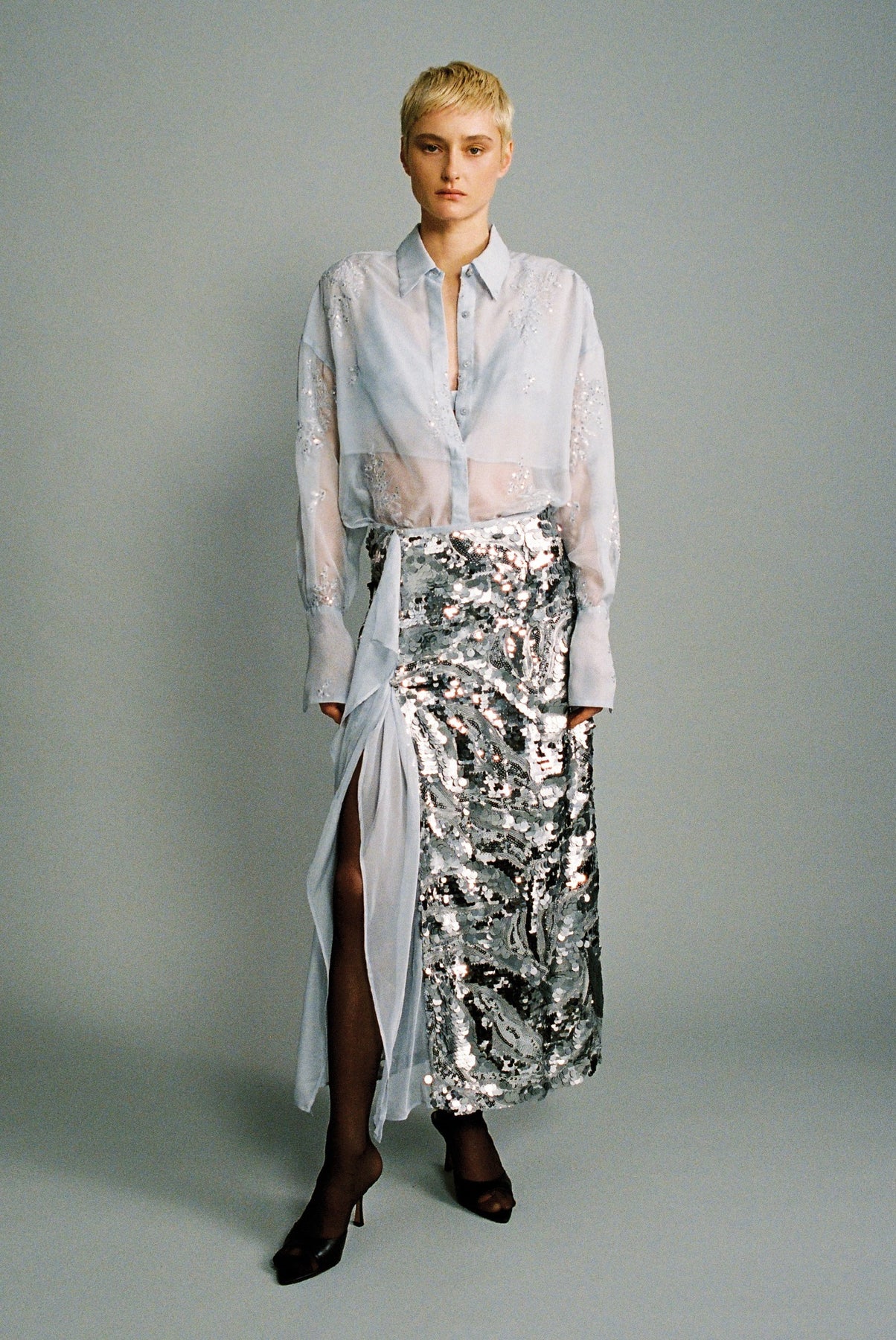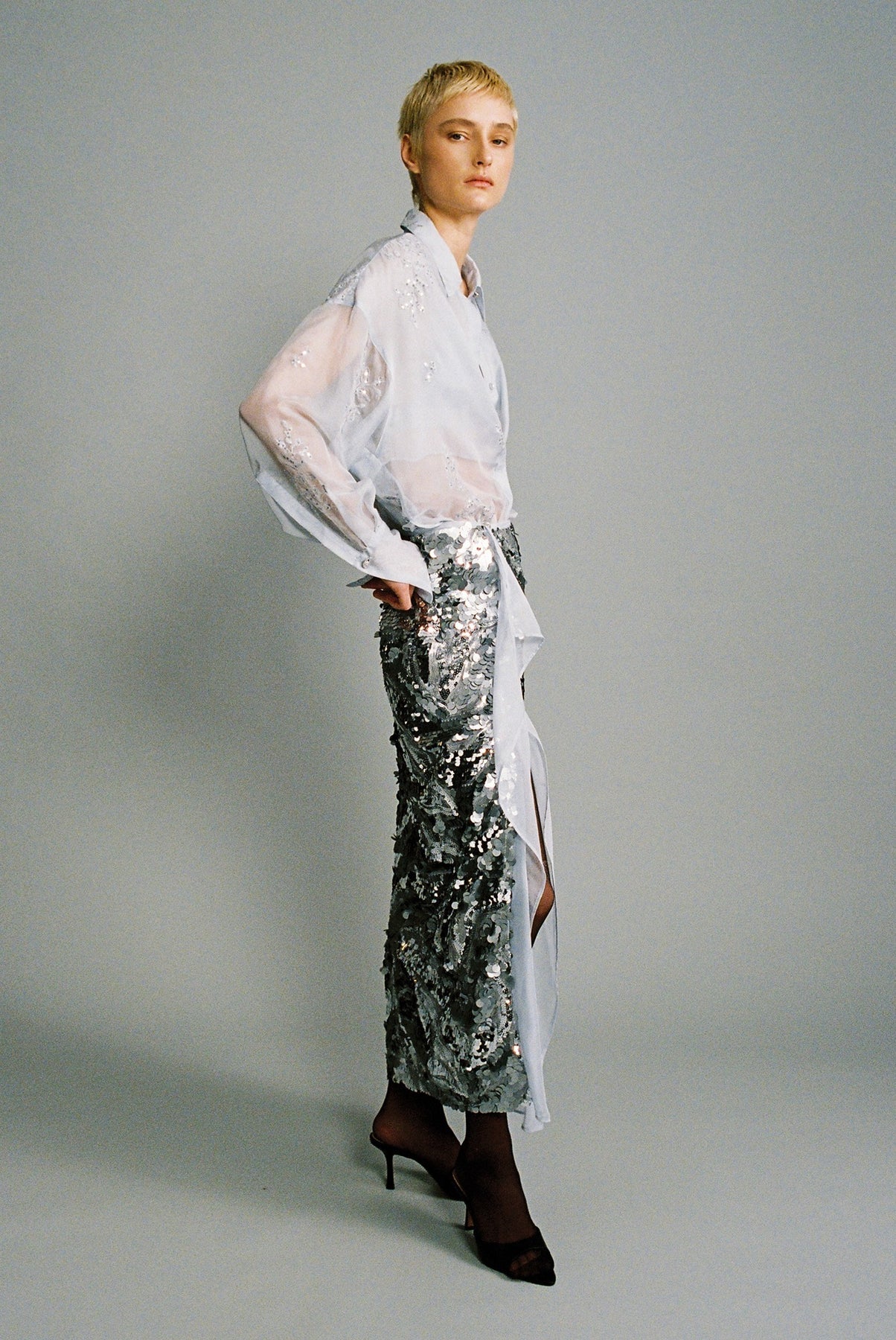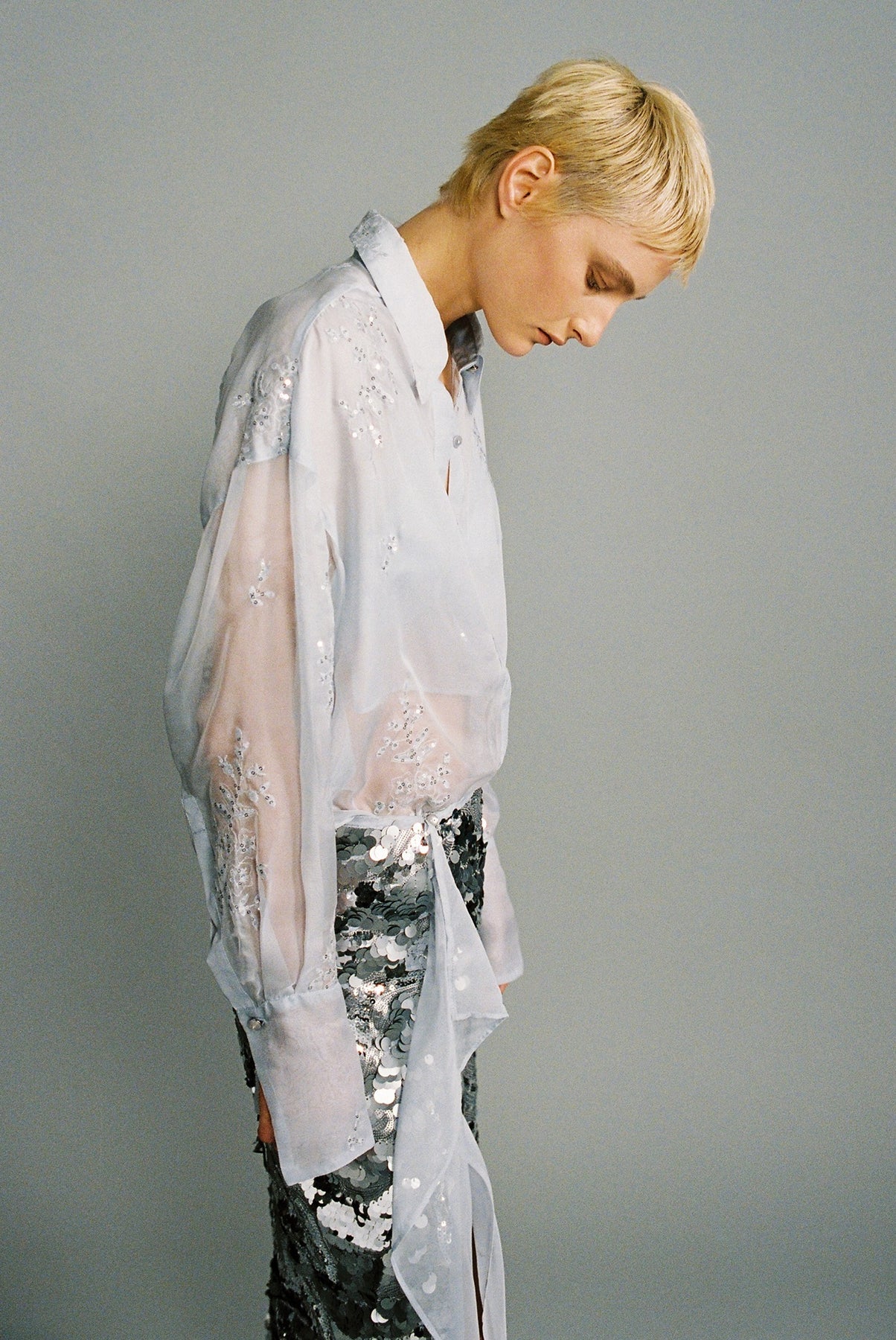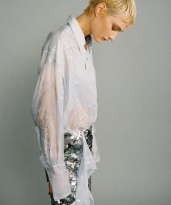 Embroidered chiffon top with a collar, long sleeves, and button closure at center front.