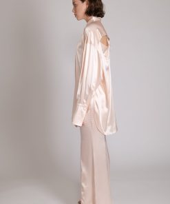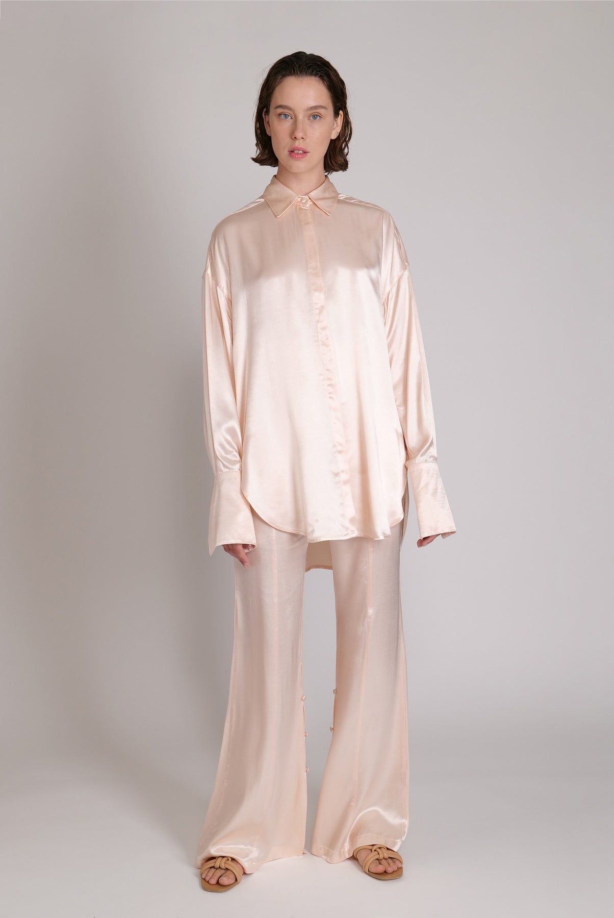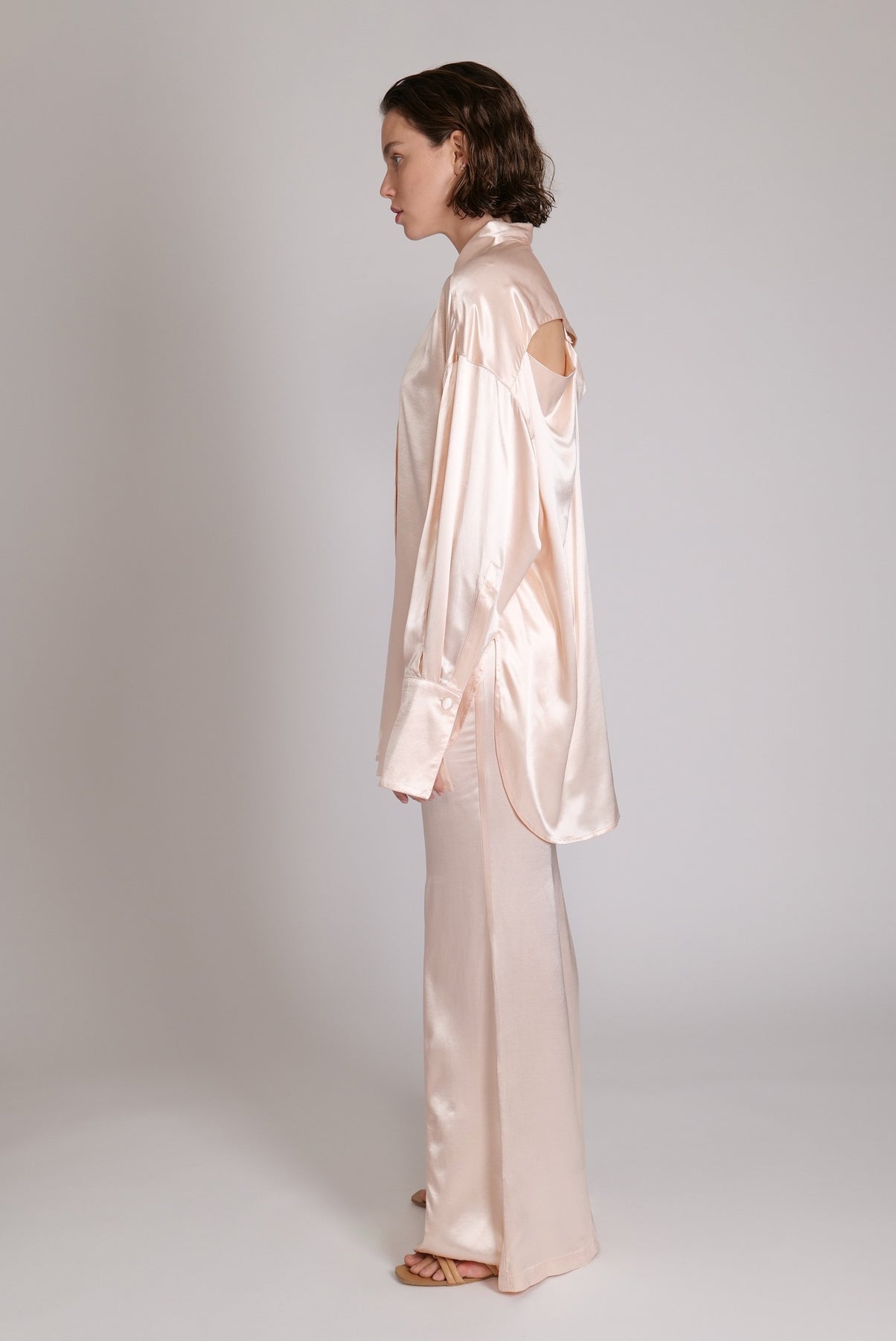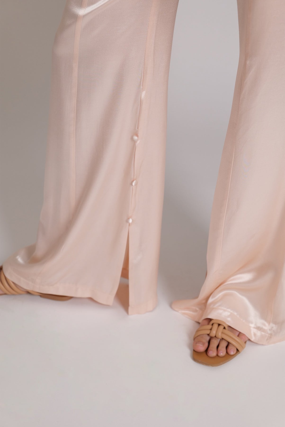 High-waist satin flared trousers with side vents and satin covered buttons, zip fly and matching covered button fastening.